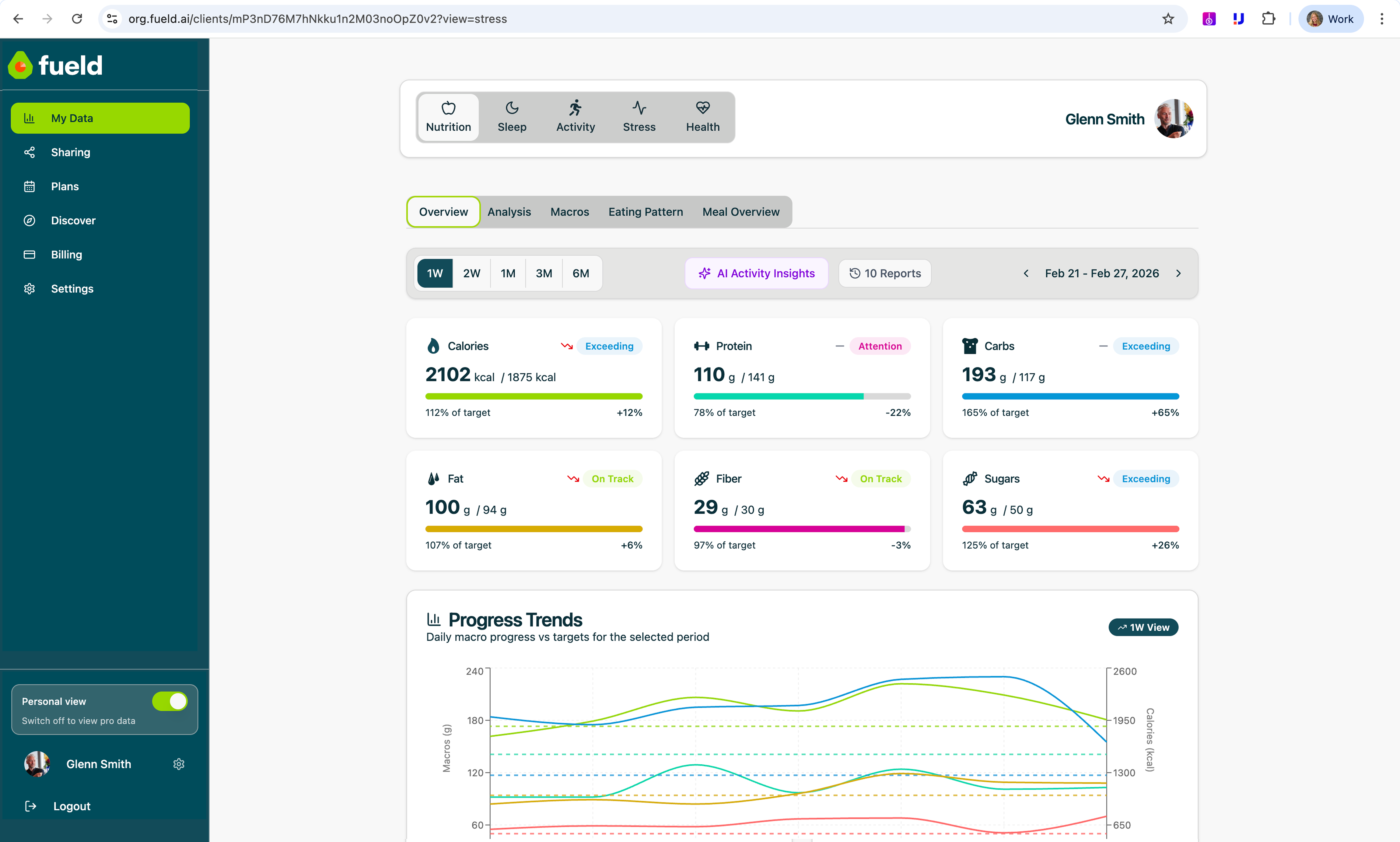 Dive deeper into your health data with the Fueld portal. Explore each pillar in detail and see how your nutrition, sleep, activity, and stress interconnect.